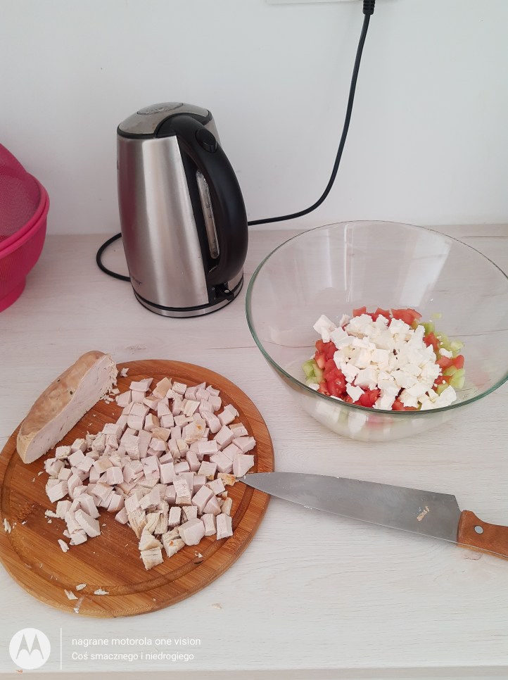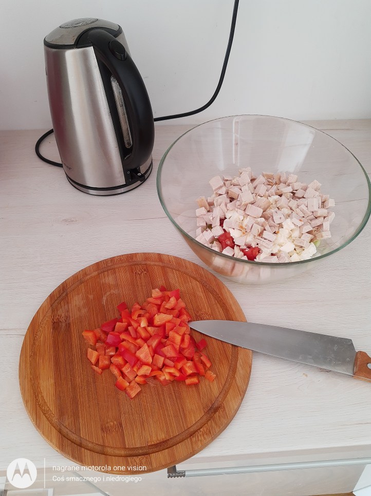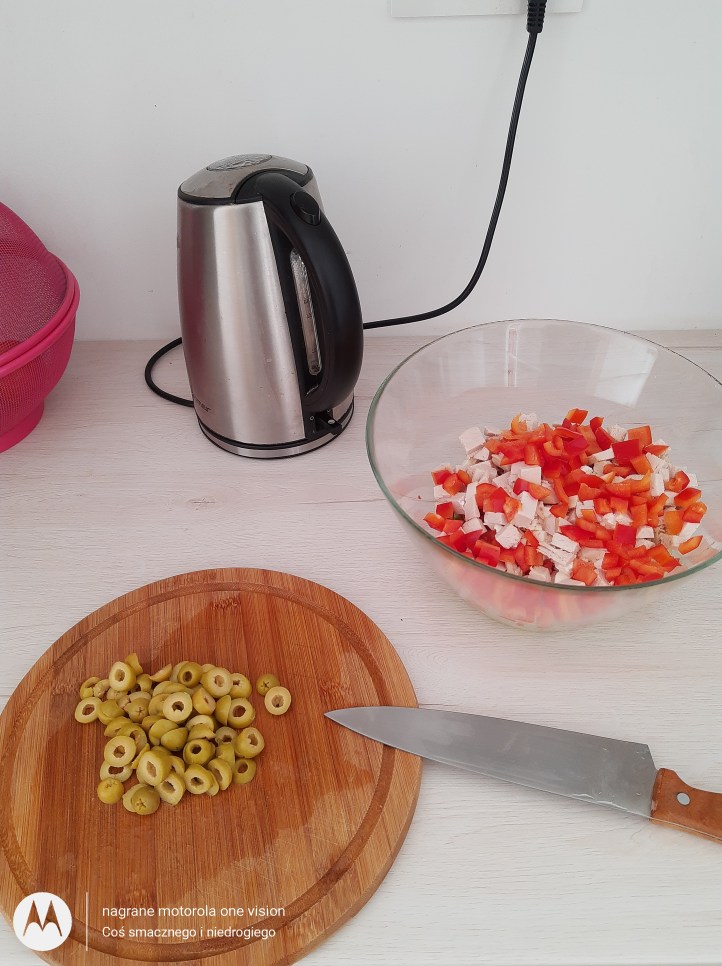 Upieczony filet z piersi indyka szatkuję i podobnie postępuję z czerwoną papryką, którą oczyszczam i myję oraz oliwkami.