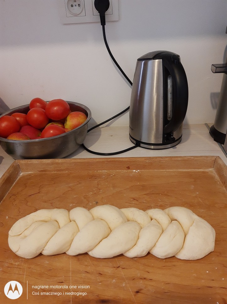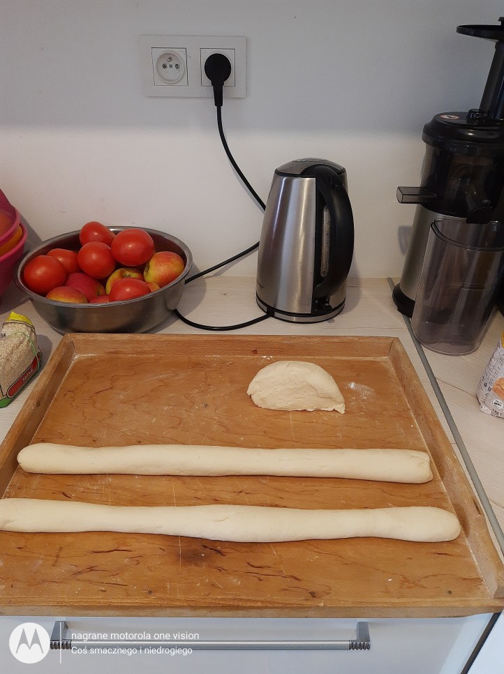 Kawałki chałki turlam aby powstały wałeczki, które górną część łączę i zaplatam podobnie jak warkocz.