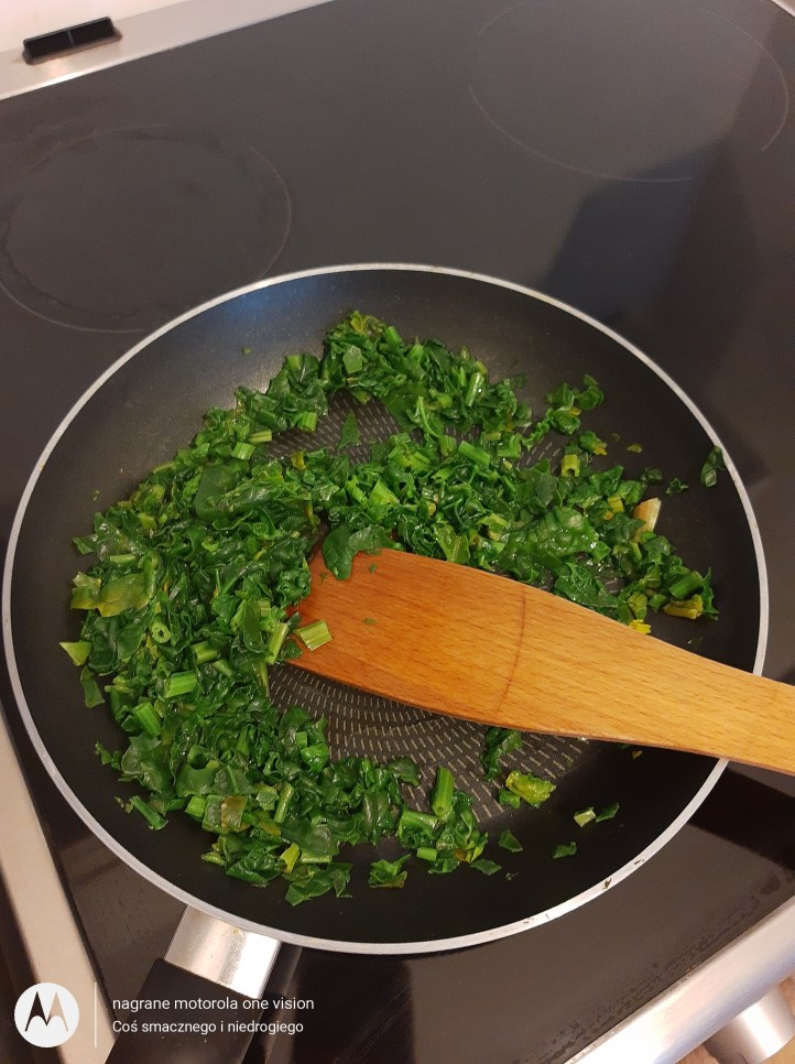Na patelni wlewam odrobinę wody i wsypuję szpinak.