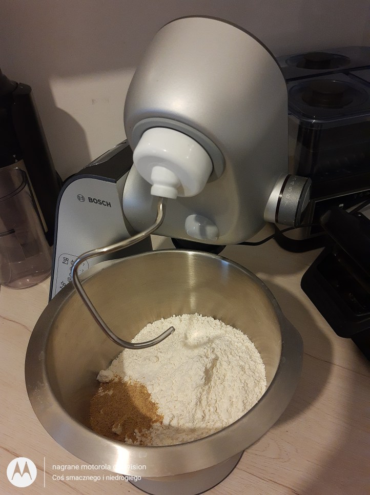 Do misy robota kuchennego Bosh Mum 5 wsypuję wszystkie suche składniki i na chwilkę uruchamiam aby się połączyły.