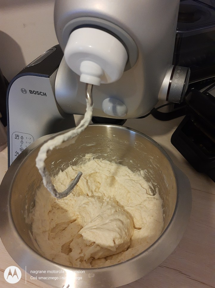 Potem powoli wlewam wodę i nadal miksując na samym końcu dodaję olej.
