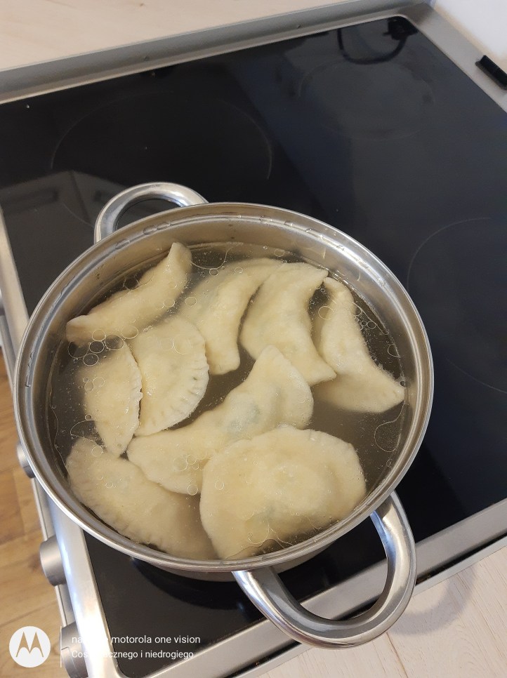 Przygotowanie pierogów rozpoczynam od ugotowania w ,,mundurkach,, ziemniaków w osolonej wodzie, które następnie studzę oraz obieram.