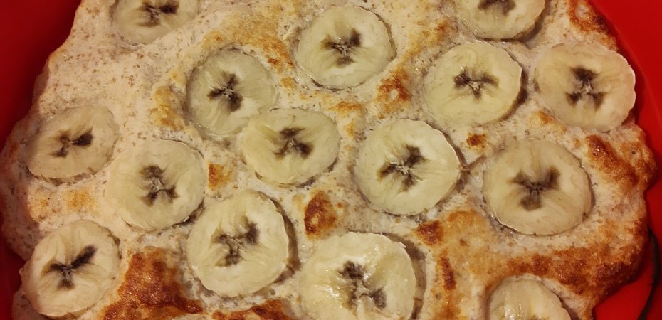 Masę przekładam do formy silikonowej i na górze kładę pokrojony w grubsze kawałki banan lekko wciskając.