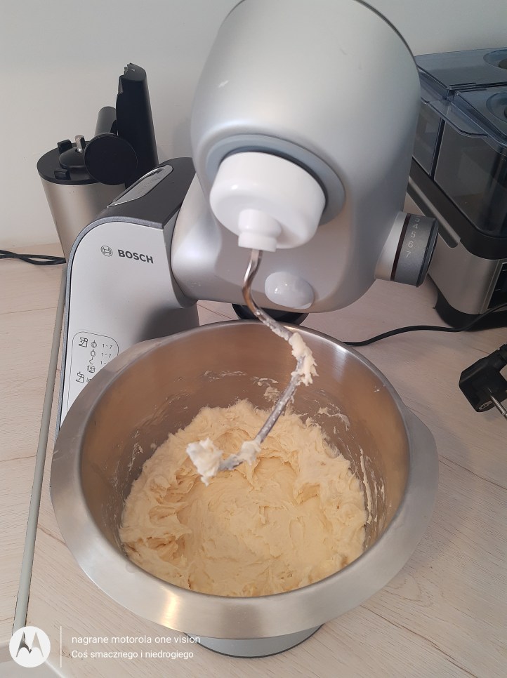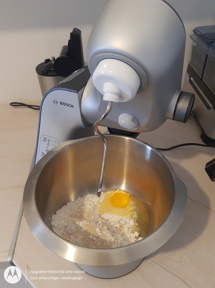 Do misy robota kuchennego Bosh Mum 5 wsypuję wszystkie suche składniki oraz wbijam jajko i uruchamiam sprzęt aby składniki się połączyły.