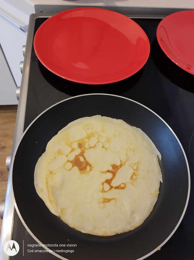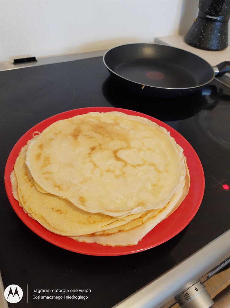 Naleśniki smażę na suchej patelni (bez użycia tłuszczu) i układam na talerzu-jednocześnie drugim przykrywam. Tak stają się wilgotniejsze i nie łamią się.