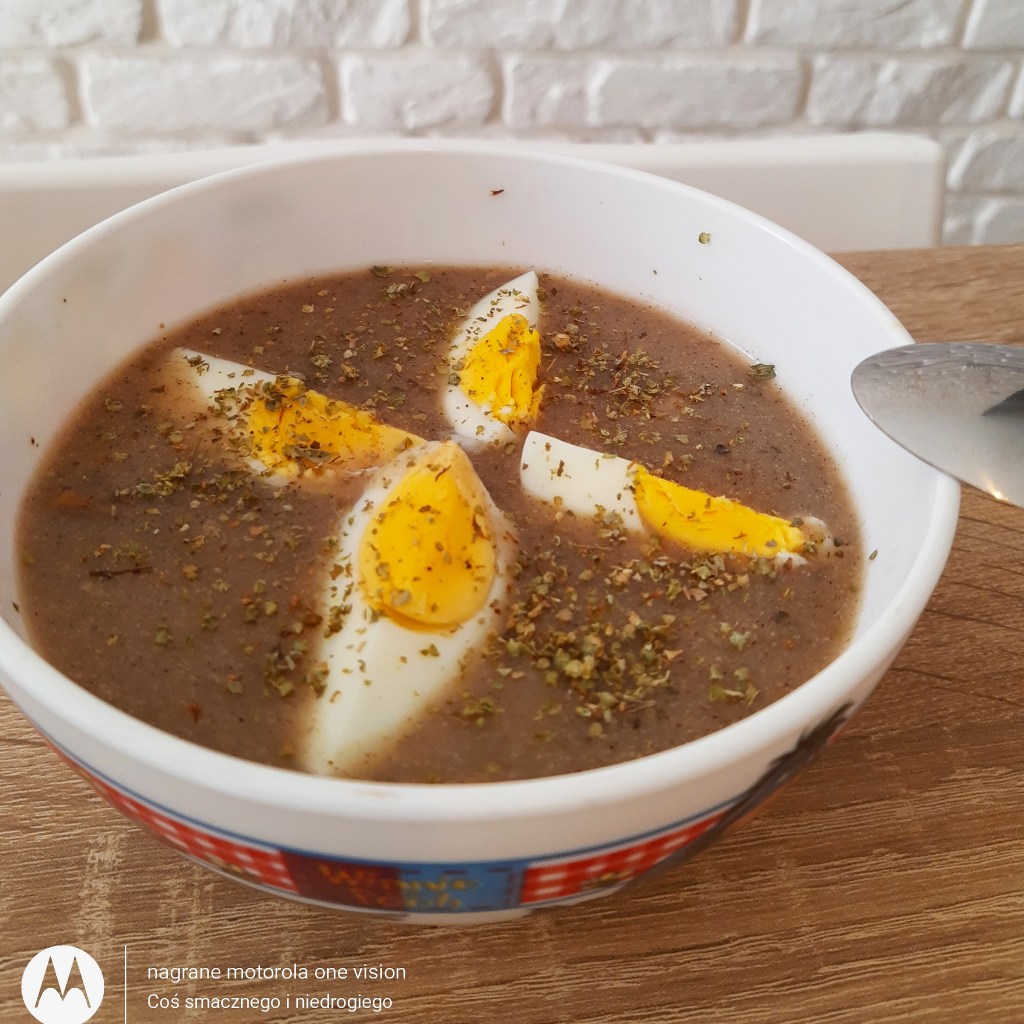 Zupę podaję z ugotowanymi jajkami i osobno ugotowaną kiełbasą oraz posypuję suszonym majerankiem.