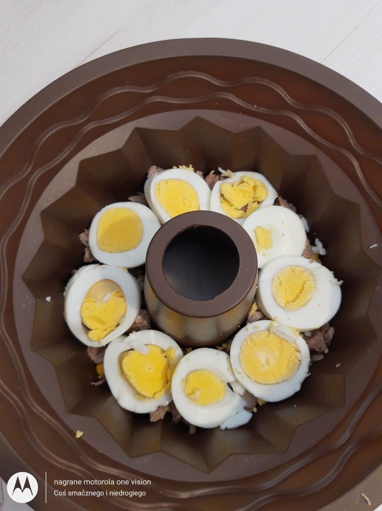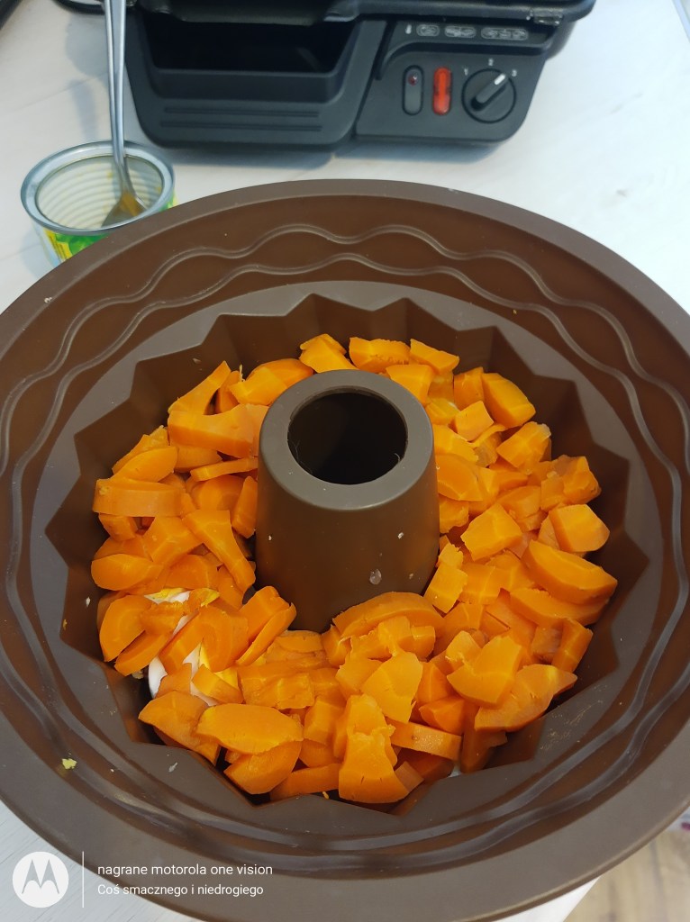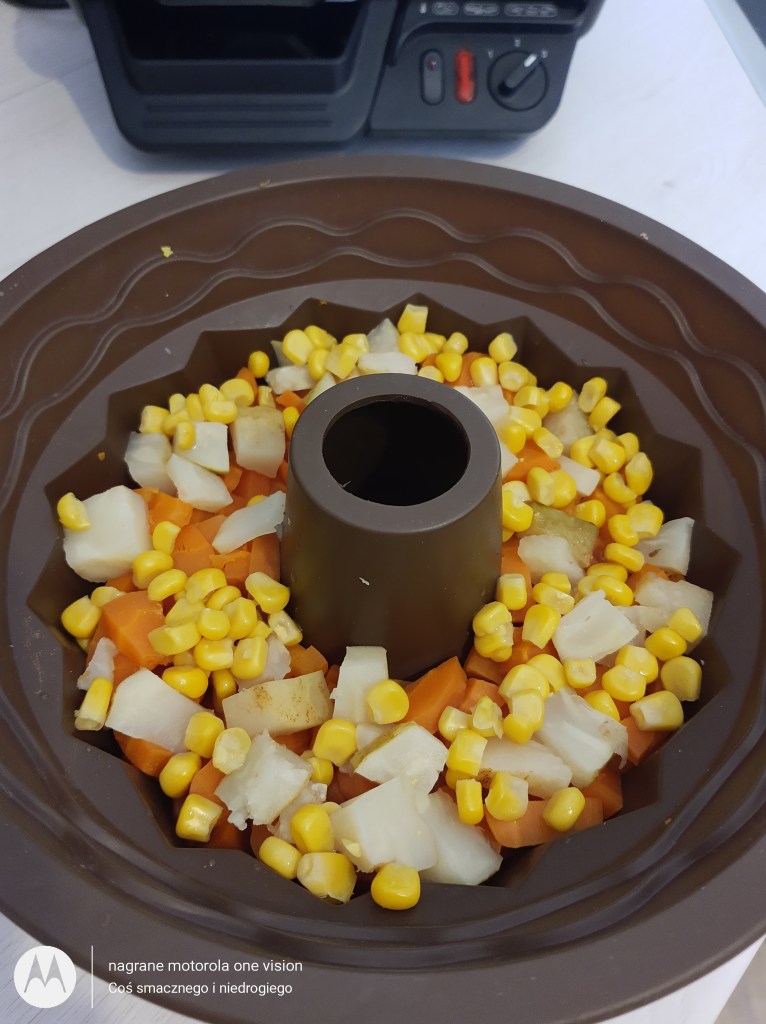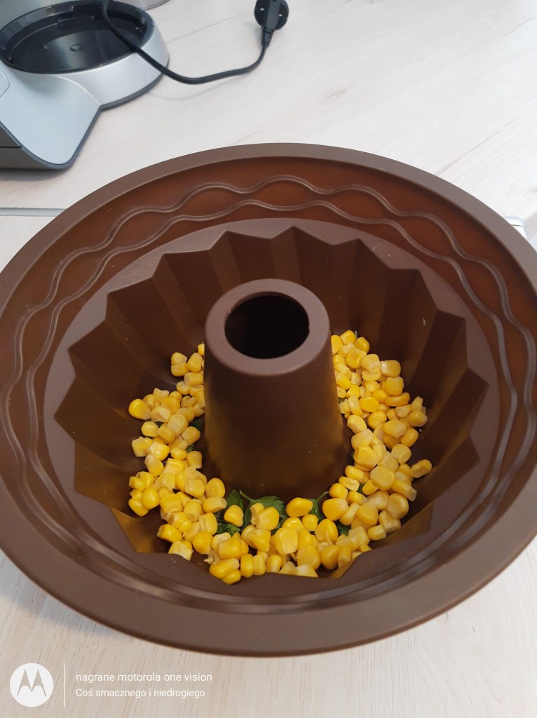 Na dno formy silikonowej układam warstwowo: umyte listki natki pietruszki, potem wsypuję połowę kukurydzy, którą wcześniej odcedzam, następnie pokrojone mięso z indyka, a na nie połowa pokrojonych w plasterki jajek, potem marchewki i po kolei: seler, pietruszki, resztę kukurydzy i pozostałe jajka.