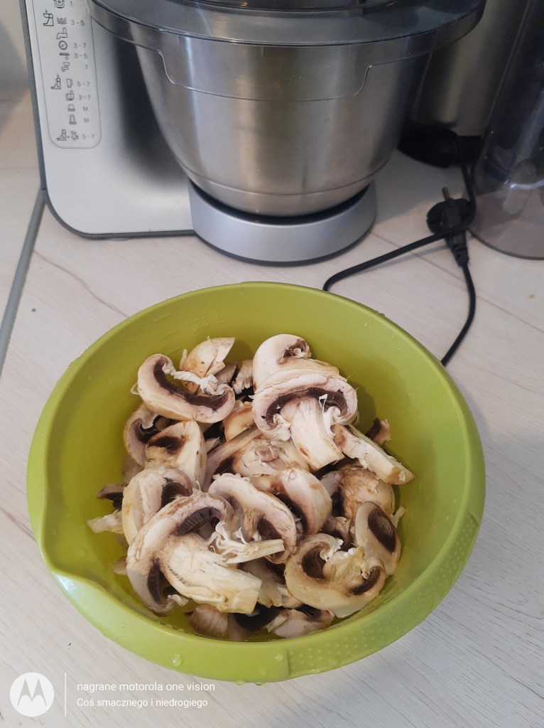 Pieczarki oczyszczam i również kroję w grubsze plasterki.