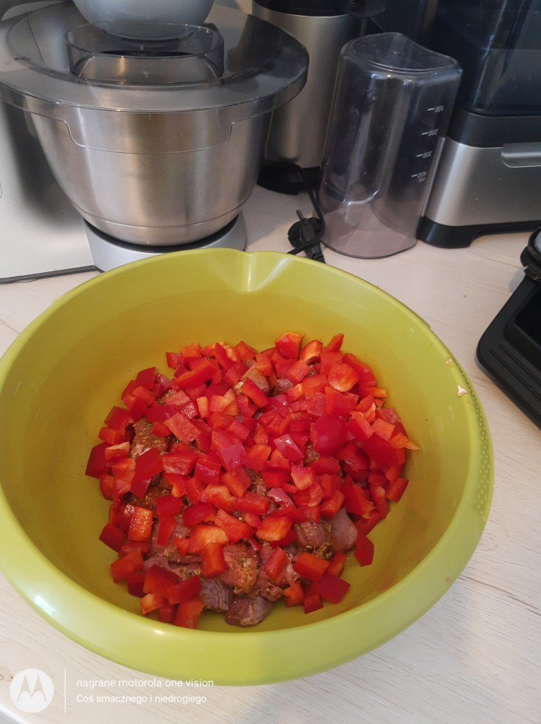 Mięso z indyka myję,osuszam oraz wstępnie obrabiam. Po czym kroję w większą kostkę i marynuję w przyprawie do indyka. Następnie odsawiam do lodówki na przynajmniej 30 minut.