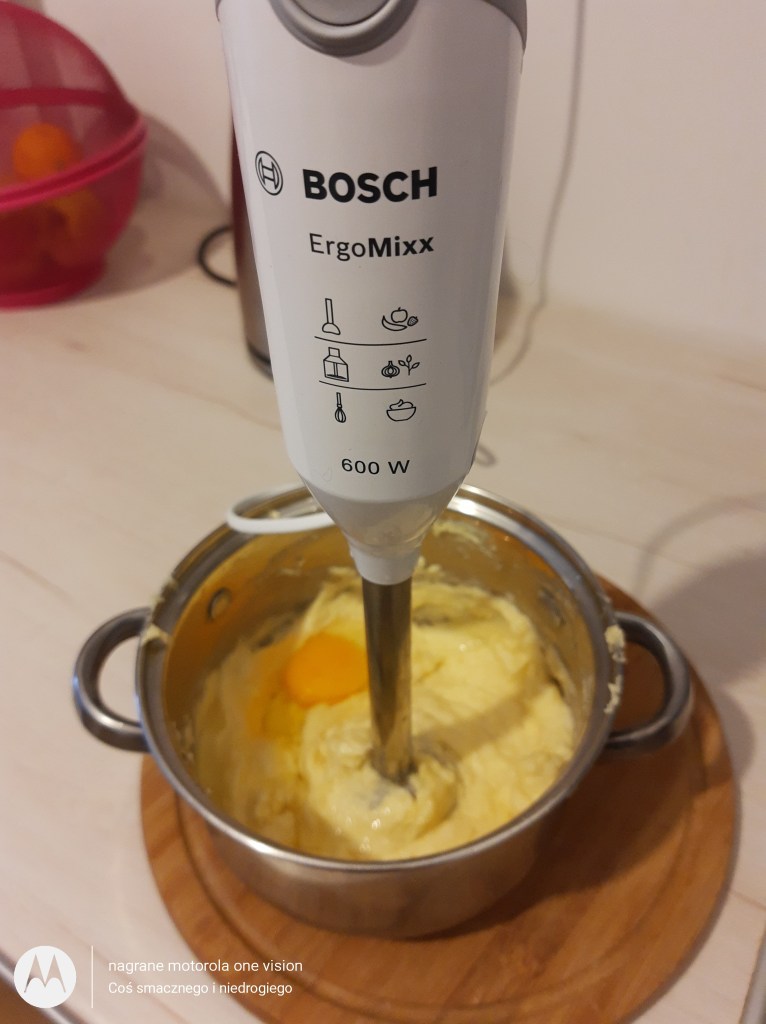Następnie wbijam po jednym jajku i blenduję (również można zmiksować) na jednolitą masę.