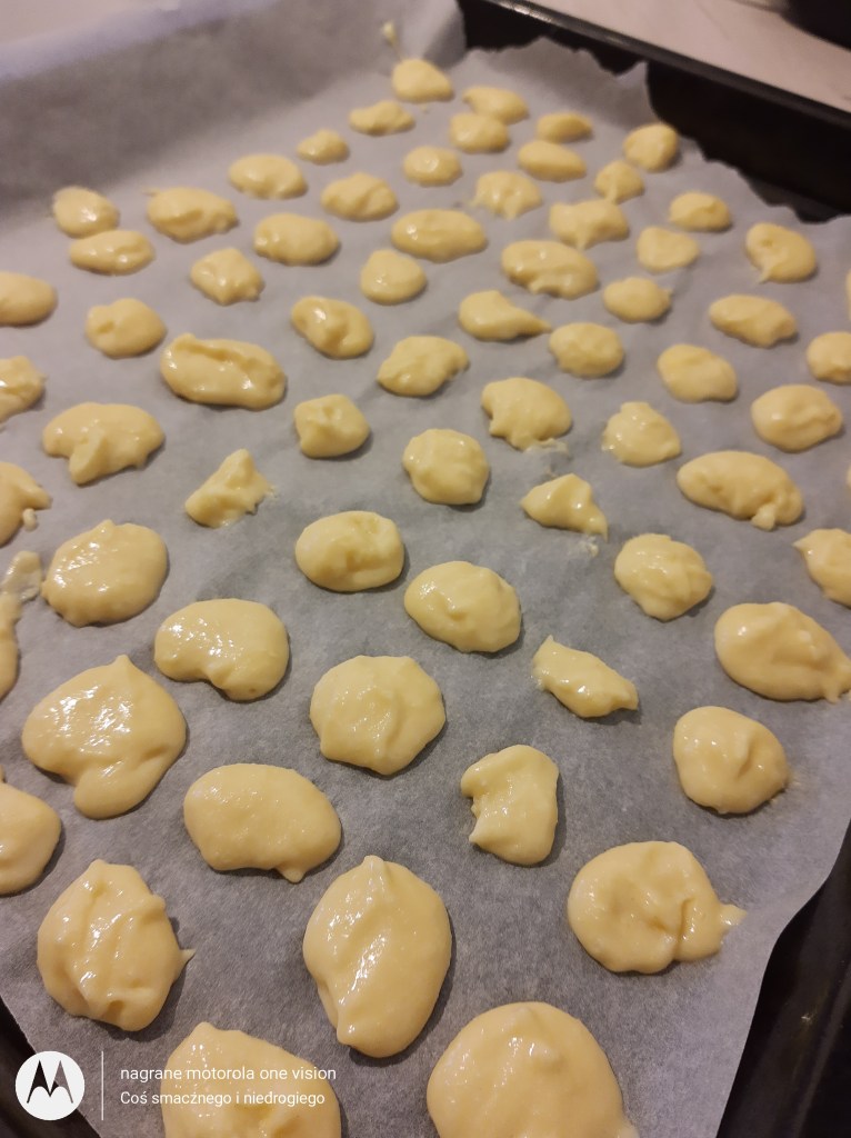 Kiedy ciasto będzie gotowe na blaszce wyłożonej papierem do pieczenia zamoczoną łyżeczką w wodzie nakładam (mniej więcej o kształcie zbliżonym do groszku). Polecam małych rozmiarów, gdyż przekąska jeszcze urośnie.