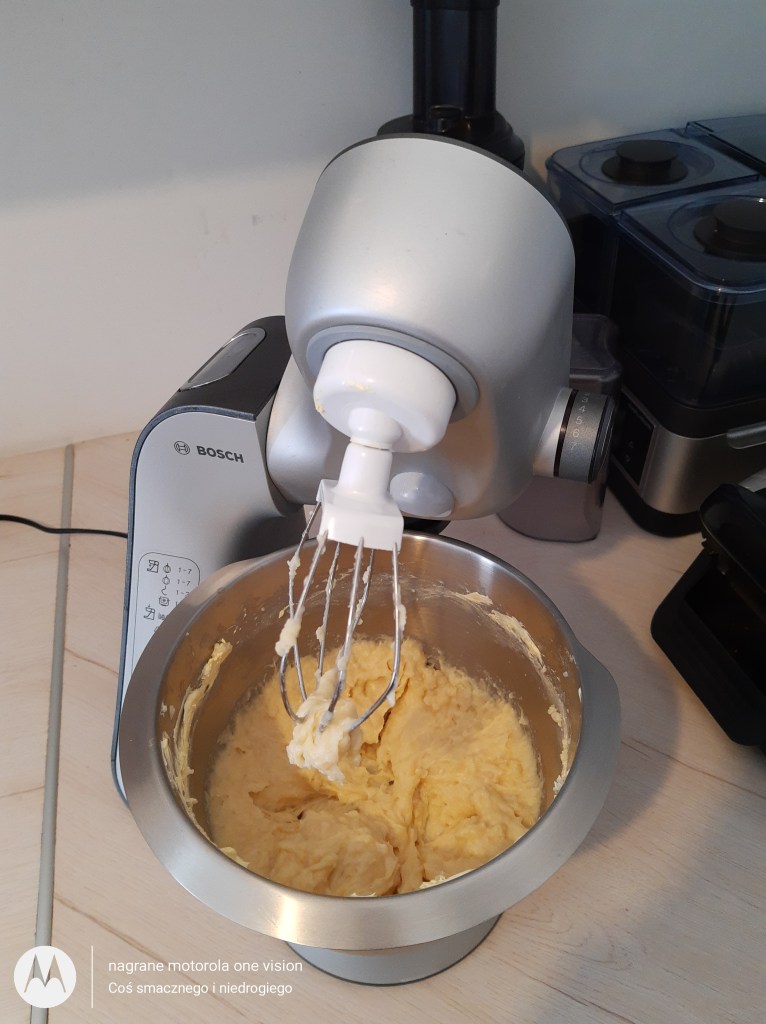 Gdy to nastąpi w misce robota kuchennego Bosh Mum 5 dodaję masło, które ucieram i łączę z masą budyniową. Krem powinien być jednolity.