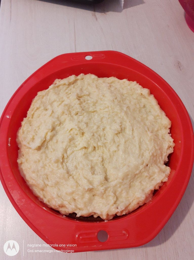 Sam spód przekładam na dno formy silikonowej, potem dodaję krem, który wygładzam łyżką, a na górę kładę pozostały biszkopt.