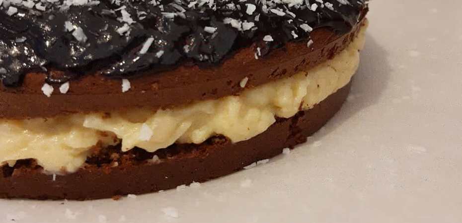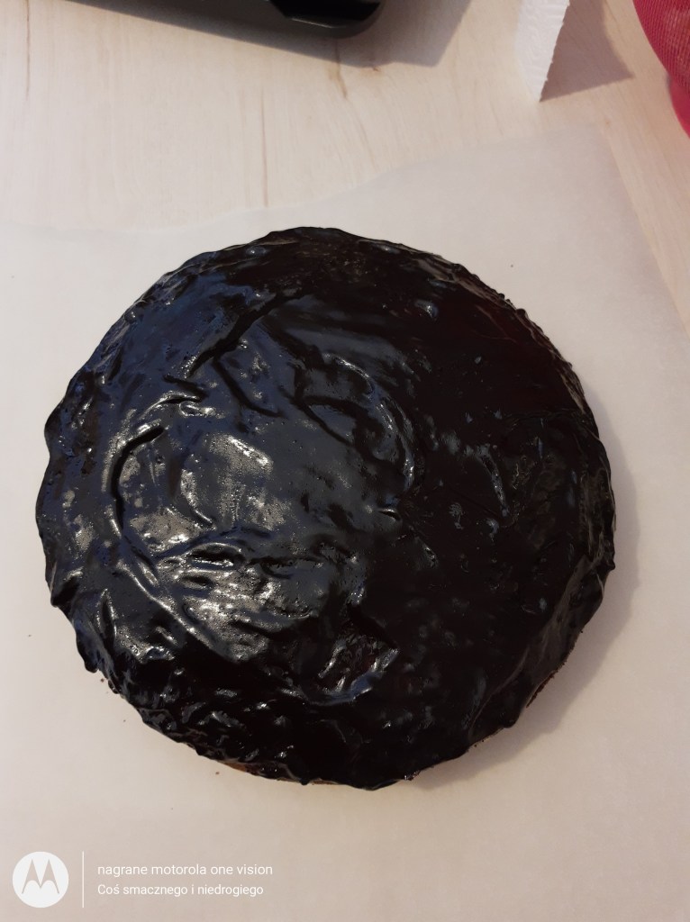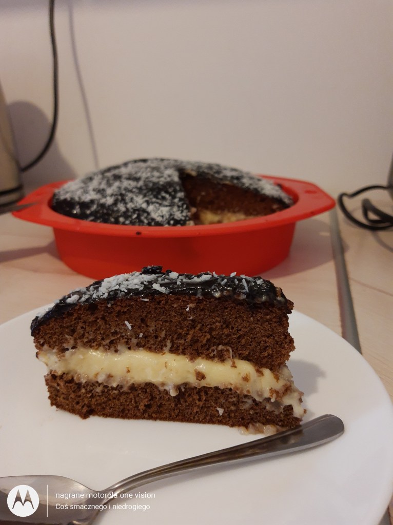 Z podanych składników tworzę polewę oraz ciepłą ozdabiam ciasto, które na sam koniec posypuję wiórkami kokosowymi.
