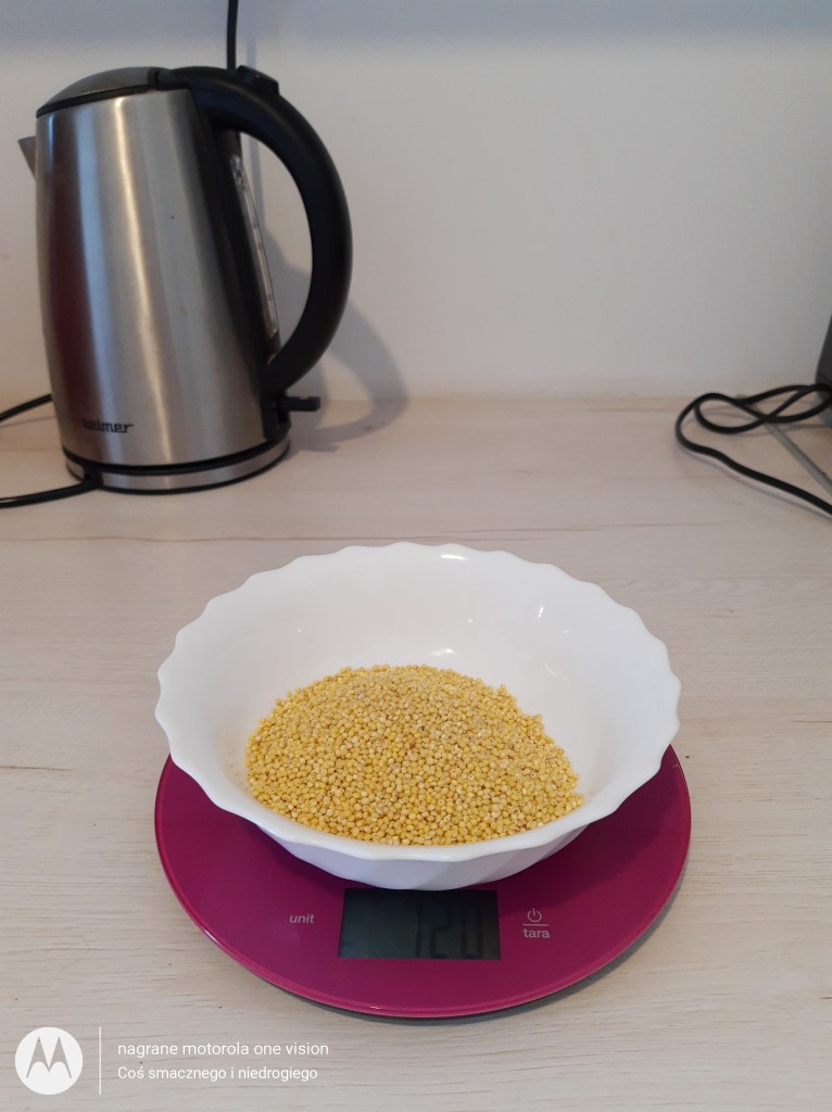 Kaszę jaglaną odmierzam i parokrotnie przepłukuję wodą (to służy pozbyciu się goryczki).