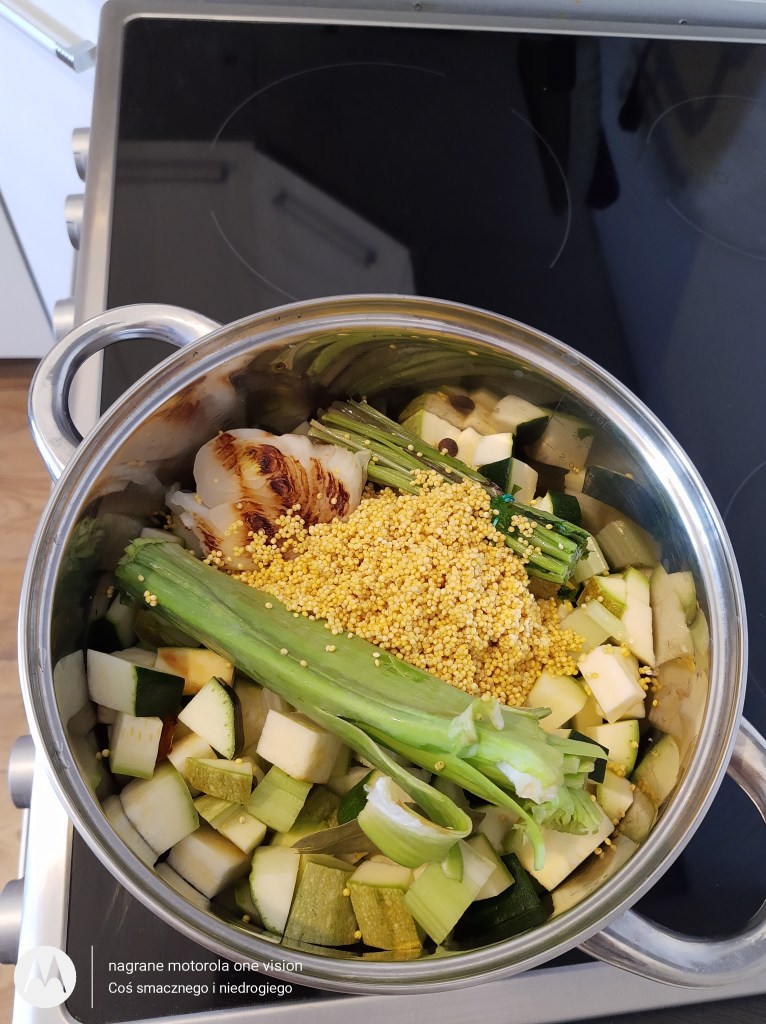 Do garnka wkładam wspomniane wcześniej: warzywa, por, imbir, cebulę, łodyżki koperku oraz kaszę, liść laurowy oraz ziele angielskie i zalewam wodą.