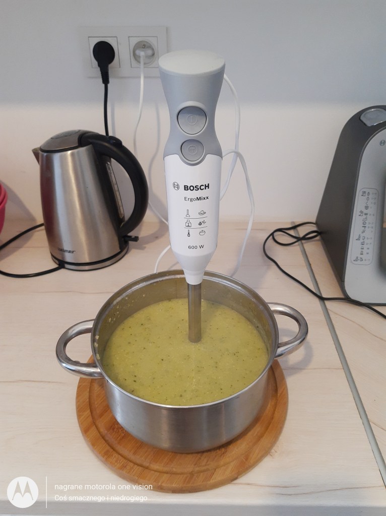 Z zupy wyjmuję: por, imbir, cebulę i przyprawy, a następnie miksuję na jednolitą masę oraz doprawiam do smaku.