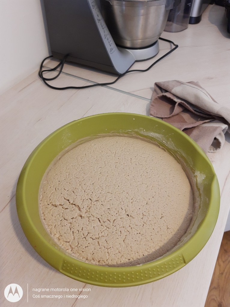 Miskę zakrywam bawełnianą ściereczkę i odstawiam do wyrośnięcia w ciepłym miejscu w kuchni przez okres 3 godzin.
