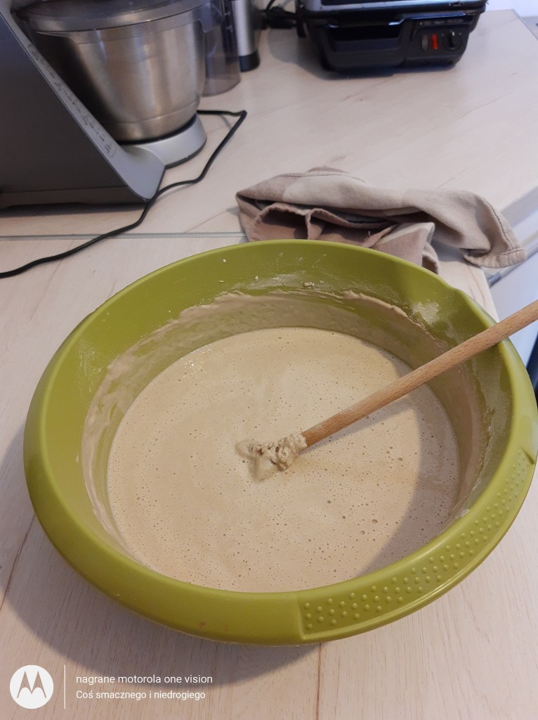 Po tym czasie ciasto znacznie wyrosło i mieszam je parokrotnie drewnianą łyżką.