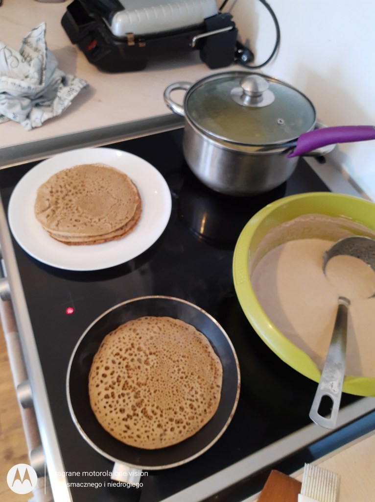 Patelnię mocno rozgrzewam lecz delikatnie można ją posmarować olejem (nie jest to konieczne). Następnie wlewam porcję ciasta.