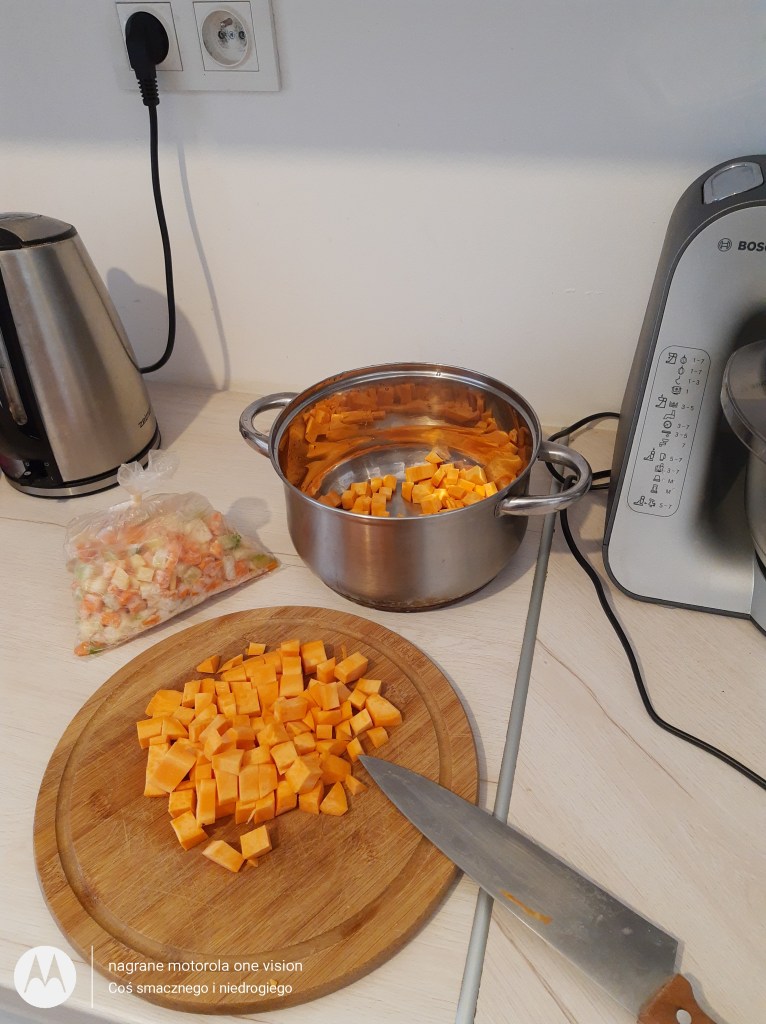 Następnie przekładam słodkie ziemniaki do garnka i dodaję także mrożoną włoszczyznę oraz zalewam niewielką ilością wody oraz gotuję do miękkości.