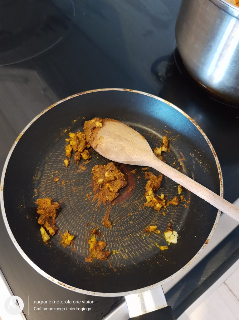 Na patelni z niewielką ilością wody dokładam po kolei: imbir wraz ze wszystkimi przyprawami.