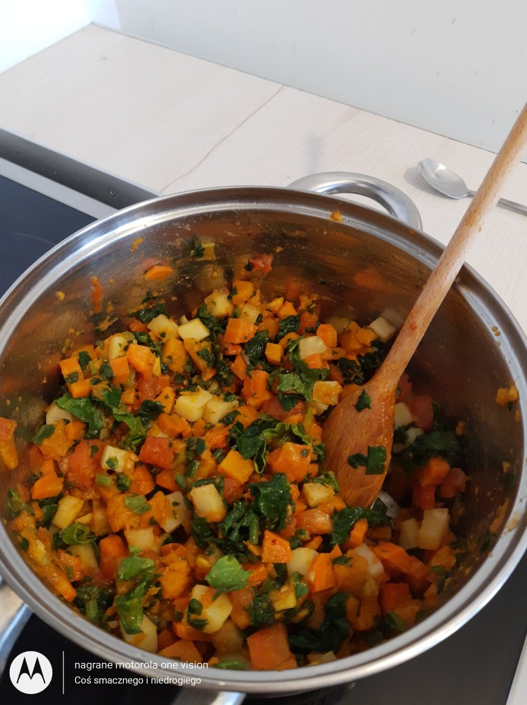 Ugotowane warzywa odcedzam oraz łączę z zawartością patelni, pokrojonymi ziemniakami i szpinakiem oraz wlewam mleczko kokosowe.