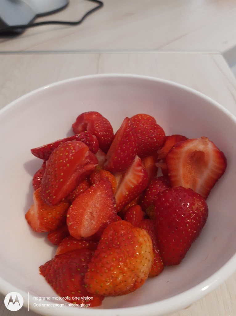 W tym czasie myję truskawki, oczyszczam oraz kroję na połowę.