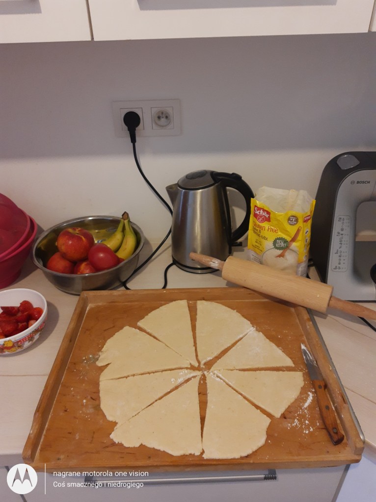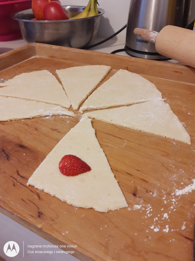 Ciasto dzielę na dwie części i na desce podsypanej mąką rozwałkowuję je na kształt kolisty, które kroję nożem tak aby uzyskać trójkąty o zbliżonych rozmiarach.