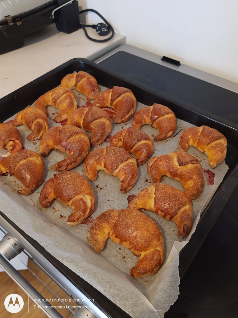 Rogaliki przekładam na blaszkę wyłożoną papierem do pieczenia i wkładam do nagrzanego piekarnika na 50 stopni w termoobiegu przez okres około 20-25 minut.