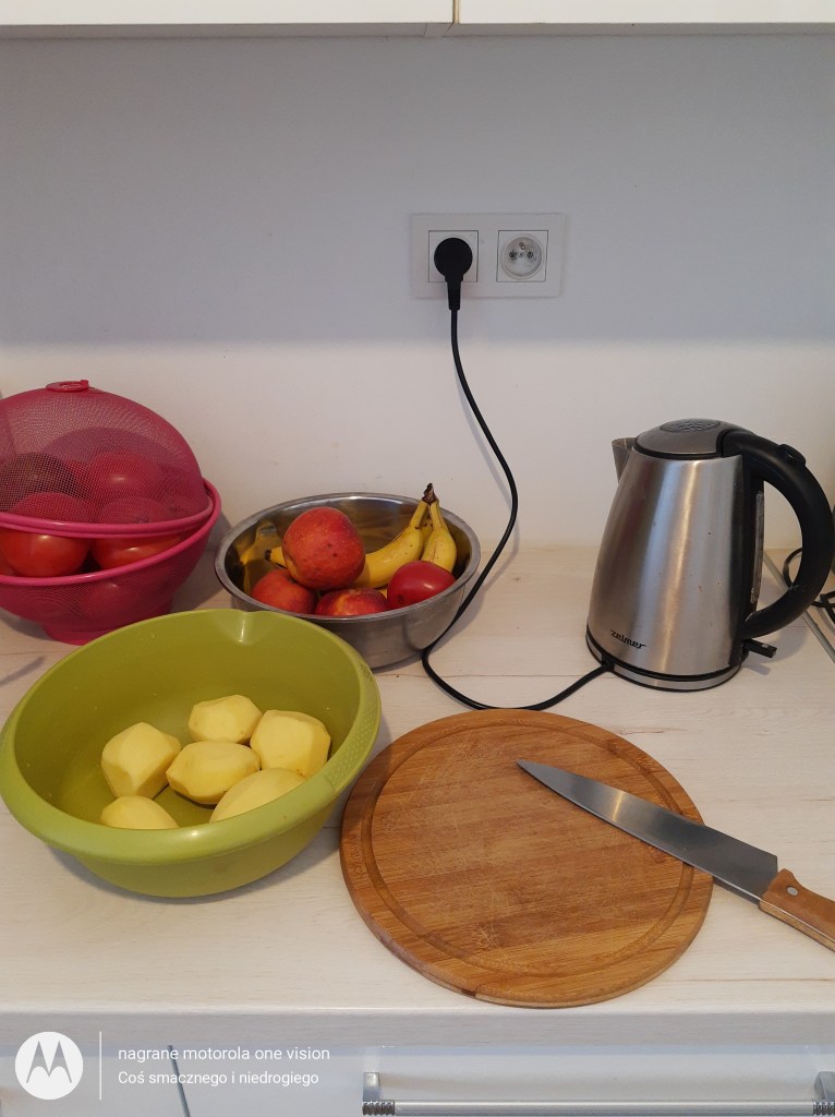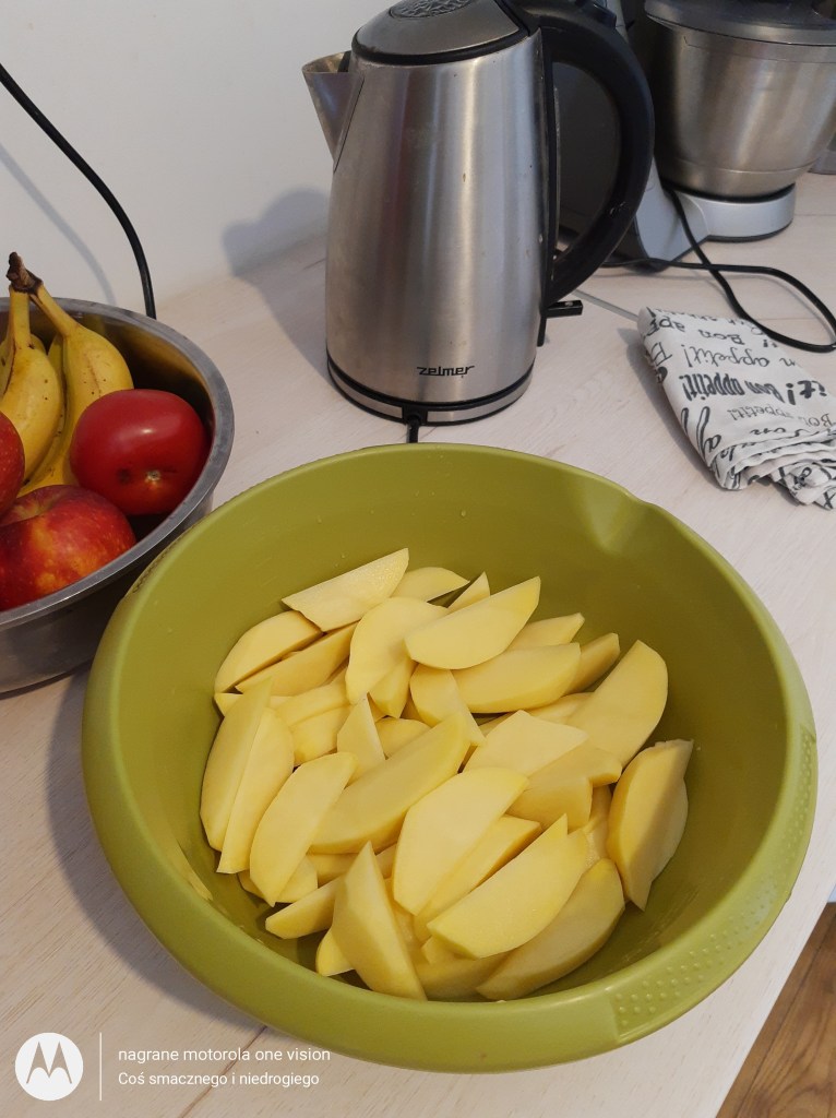 Ziemniaki obieram oraz myję i kroję w średniej wielkości ćwiartki.
