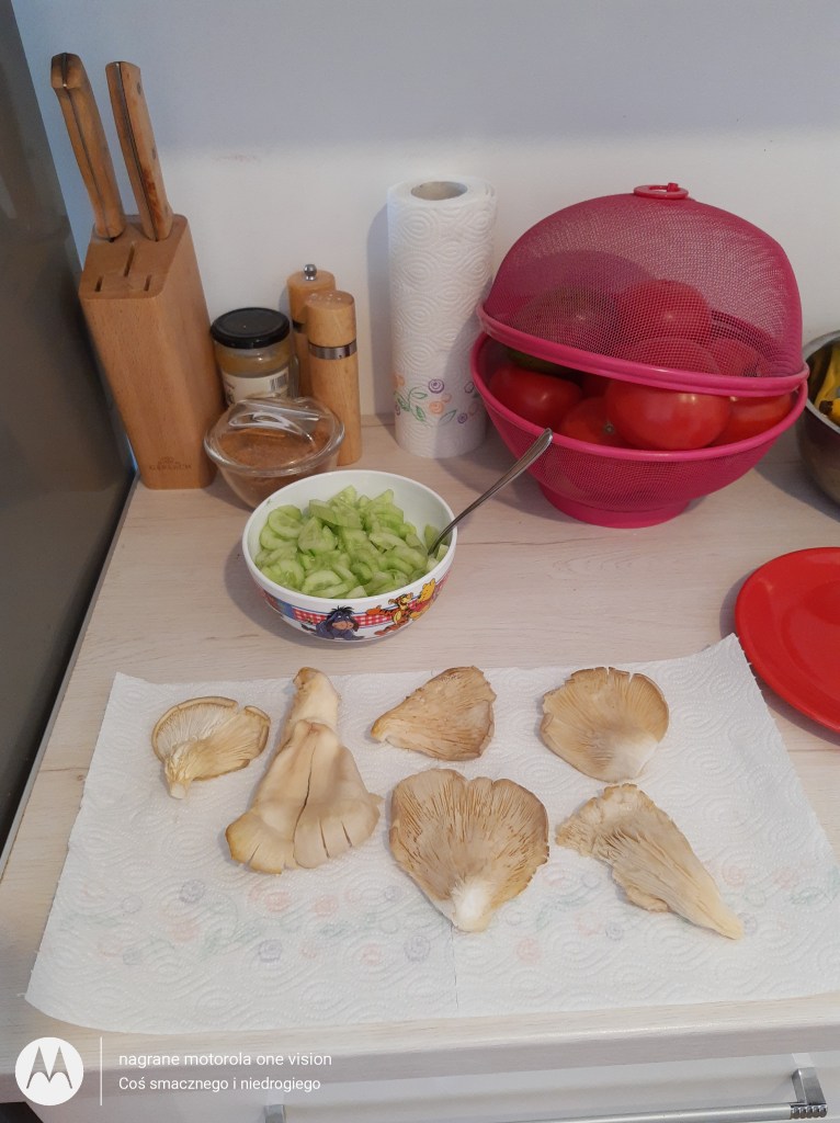 W tym czasie przygotowuję boczniaki, które wstępnie oczyszczam oraz solę.