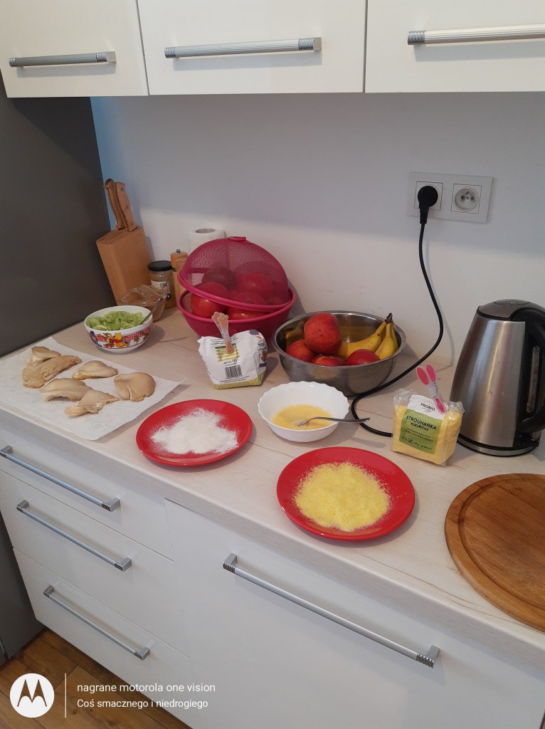 Na osobnych dwóch talerzach wsypuję mąkę ryżową oraz bułkę tartą bez glutenu.