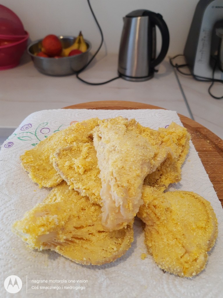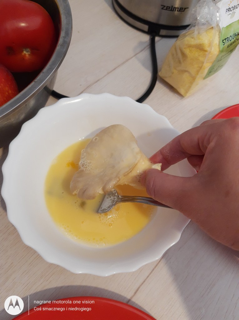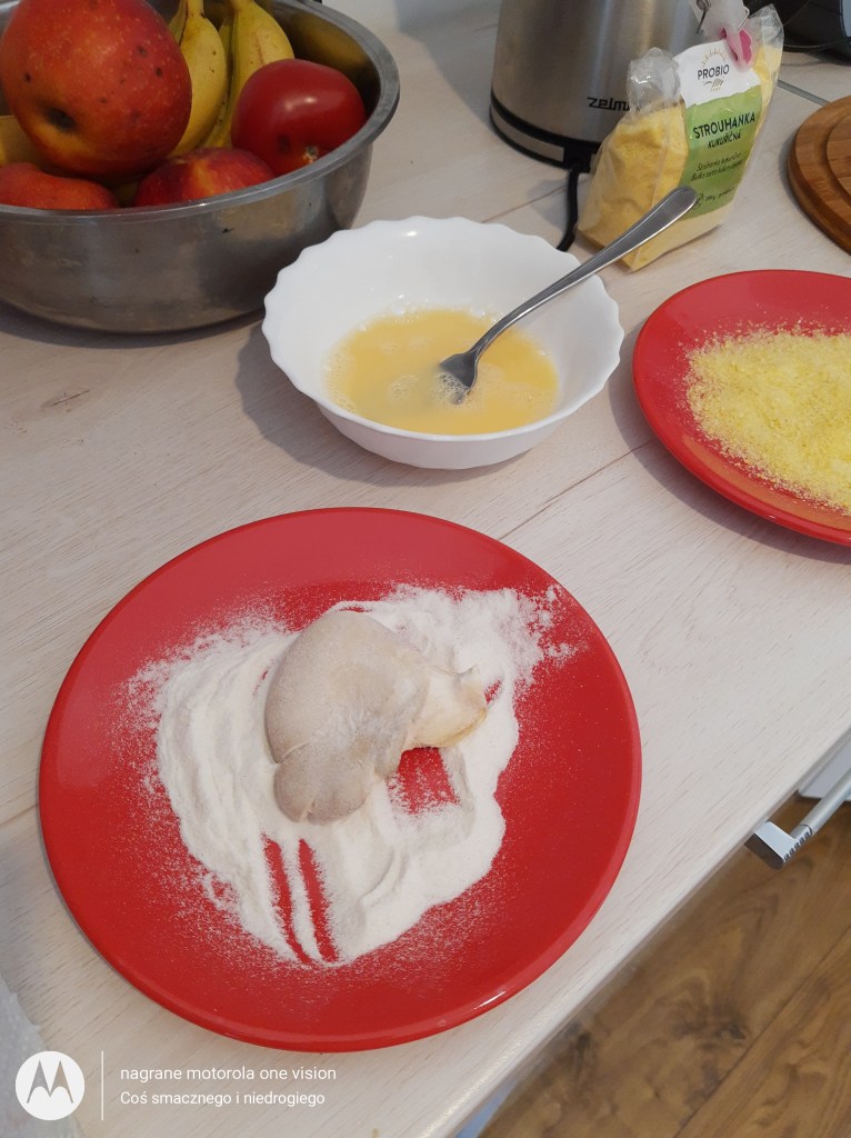 Każdego boczniaka panieruję najpierw w mące, potem w jajku a następnie w bułce tartej oraz przekładam na deskę wyłożoną ręcznikiem papierowym.