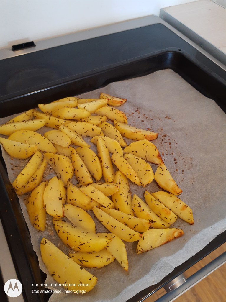 Rękoma wcieram przyprawy oraz przekładam ziemniaki na blaszkę wyłożoną papierem do pieczenia i wkładam do nagrzanego piekarnika na ok 180 stopni na funkcji termoobieg przez 20 minut.