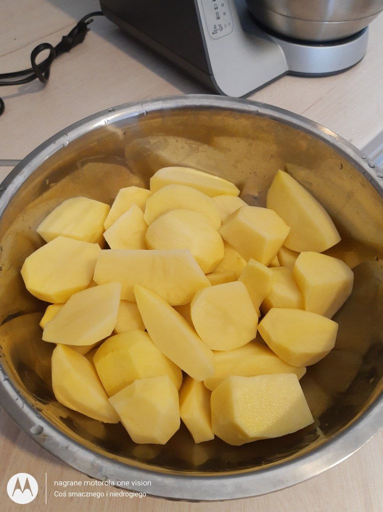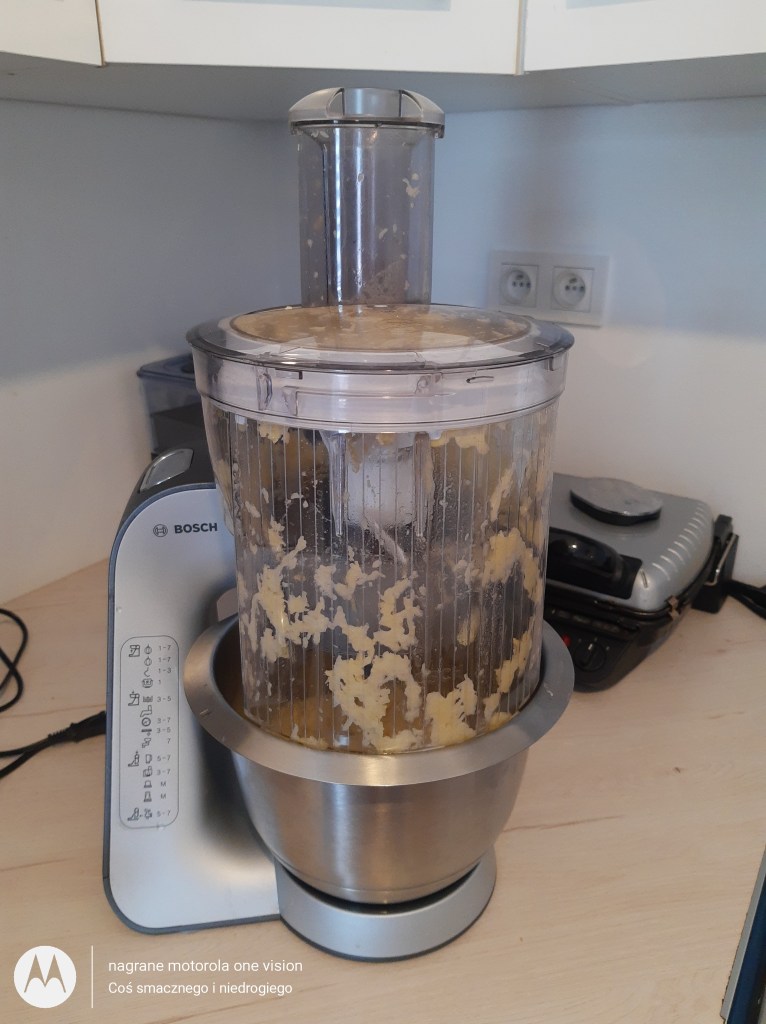 Zaczynam od obrania ziemniaków, następnie myję i ścieram w robocie kuchennym Bosh Mum 5 na specjalnej tarce do pyz.