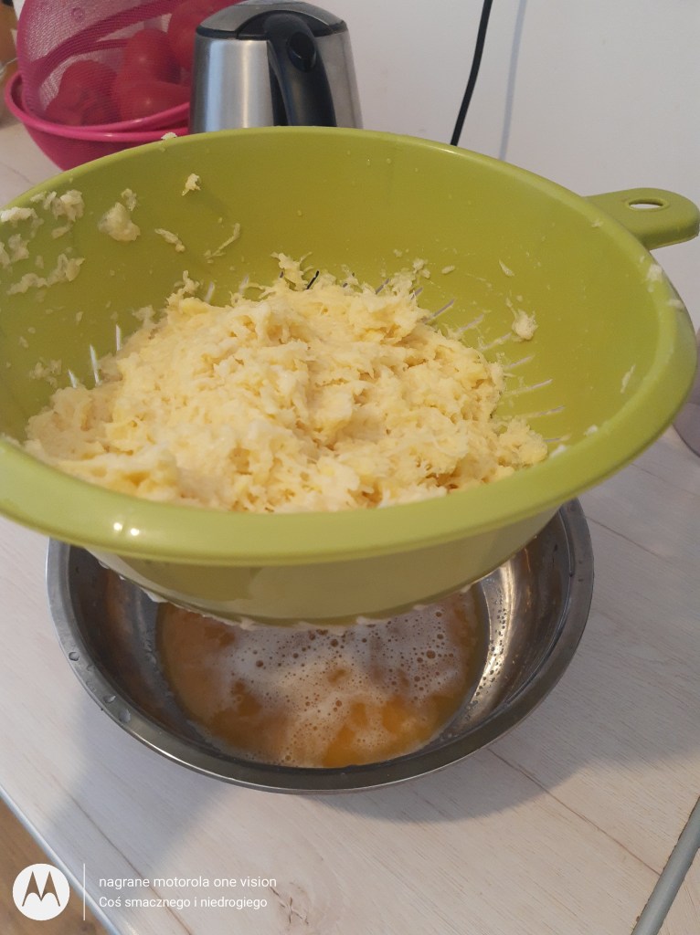 Masę ziemniaczaną przekładam na sitko, którą odcedzam z nadmiaru płynu.