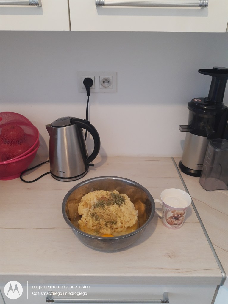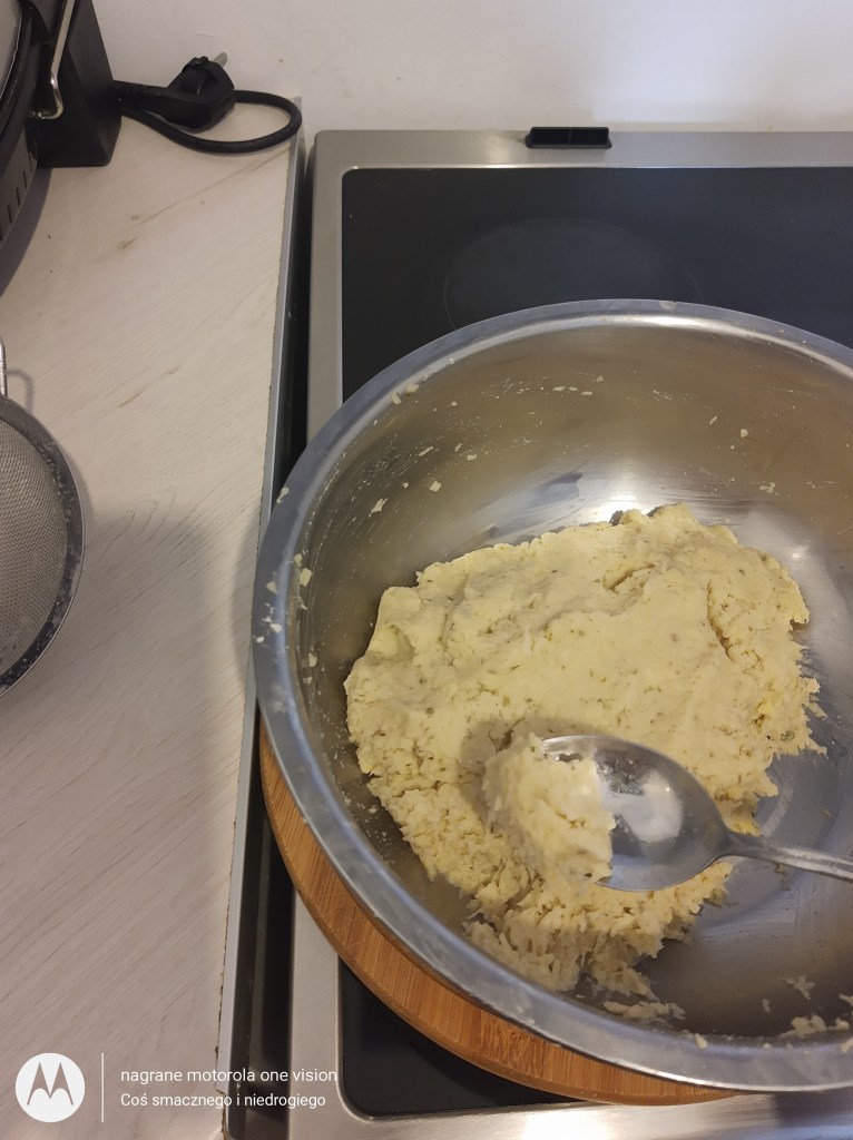 Sok zalewam (ale pozostawiam skrobię), do której dodaję: starte ziemniaki, wbijam jajko, wsypuję mąkę oraz przyprawy i następnie masę dobrze wyrabiam.