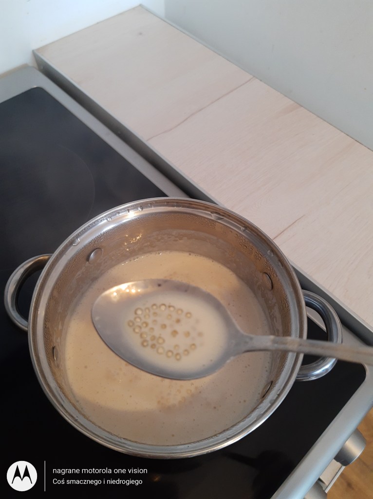 Zmniejszam moc palnika i nie przerywając mieszania czekam do momentu kiedy będzie ona gotowa.