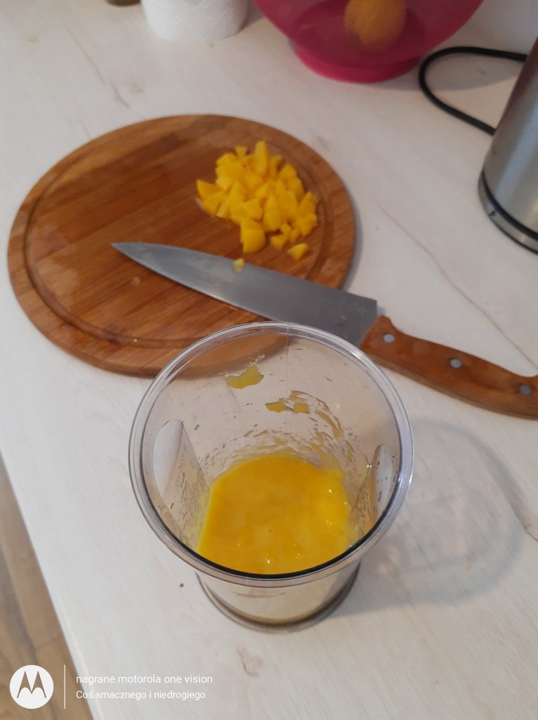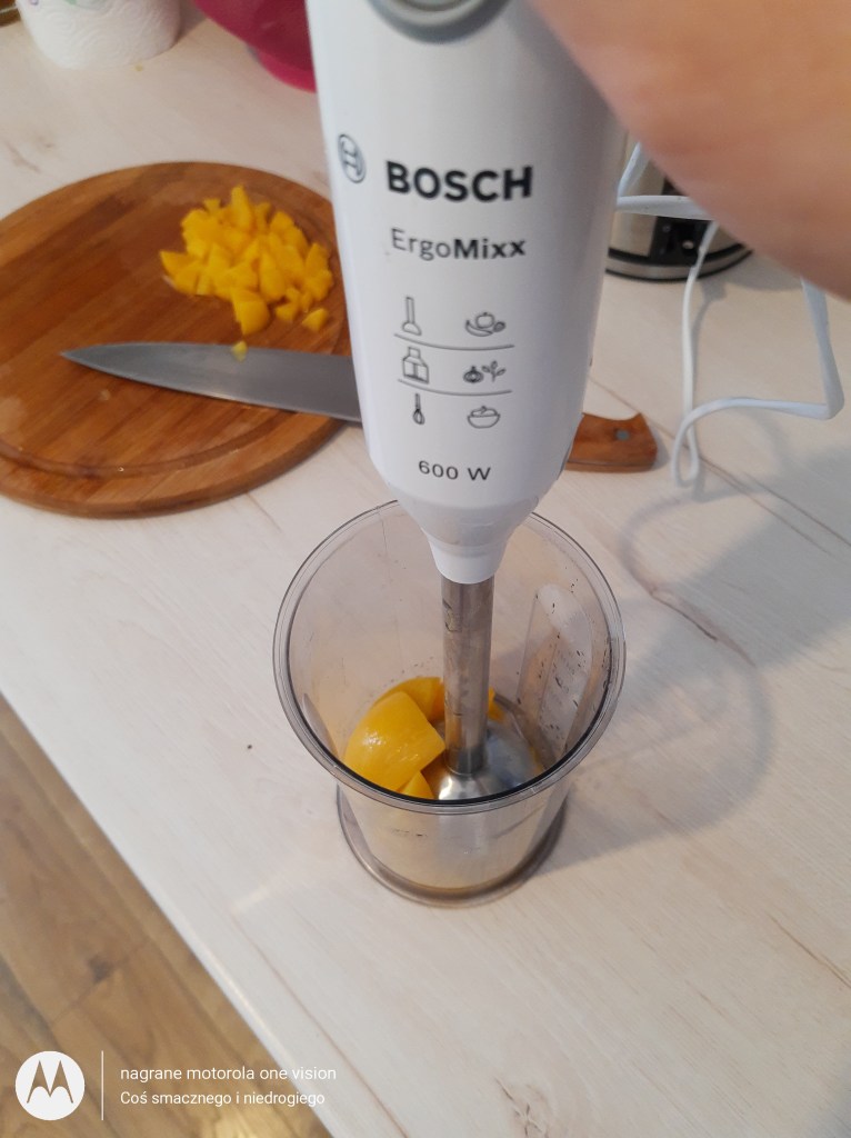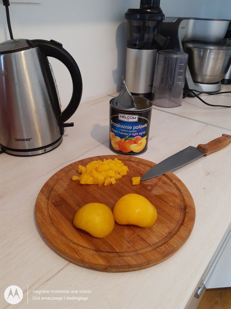 Puszkę z brzoskwiniami otwieram oraz pozostawiam 2-3 do pokrojenia, a resztę blenduję na gładką masę.