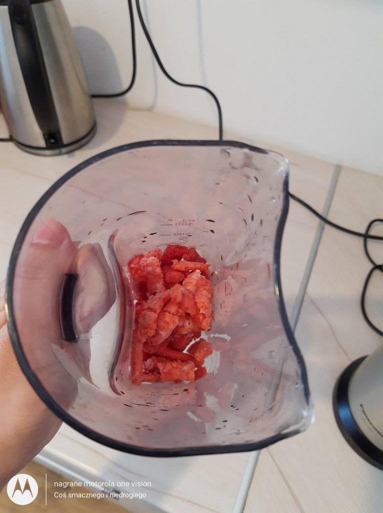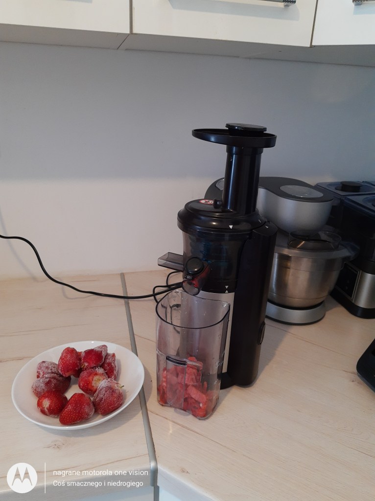 Truskawki wkładam do odpowiednio zamontowanej wyciskarki po czym przepuszczam na mus.