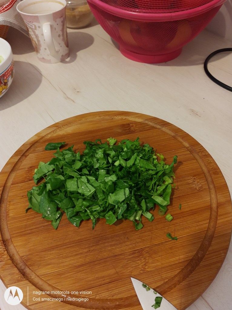 Następnie myję i drobno kroję szpinak i łączę z całą masą.
