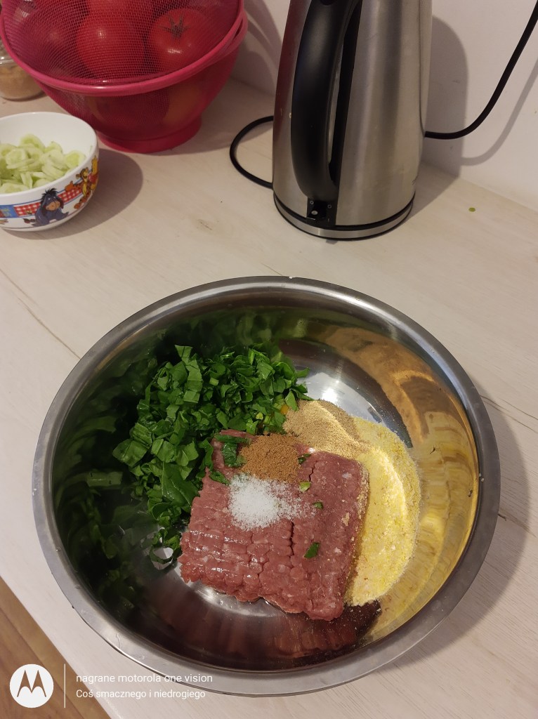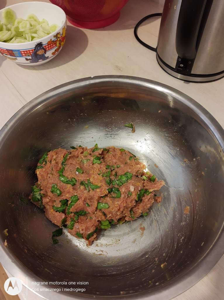 Do większej miski dodaję mięso mielone oraz wbijam jajko.