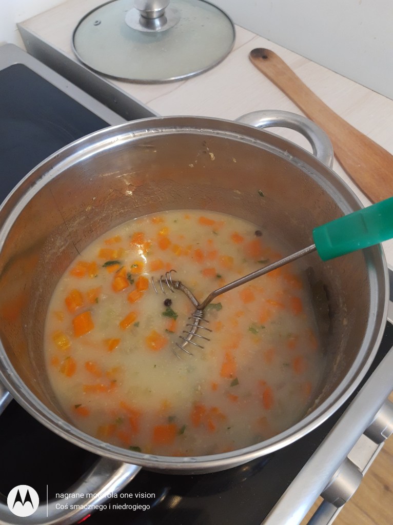Podobnie postępuję z selerem naciowym oraz oba drobno kroję i przekładam do garnka, który zalewam wodą i dokładam: liść laurowy wraz z zielem angielskim.