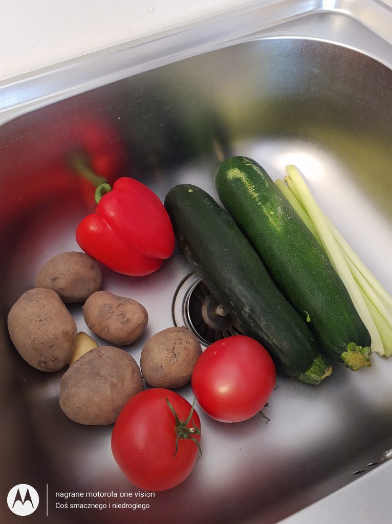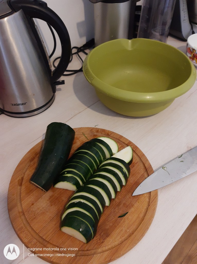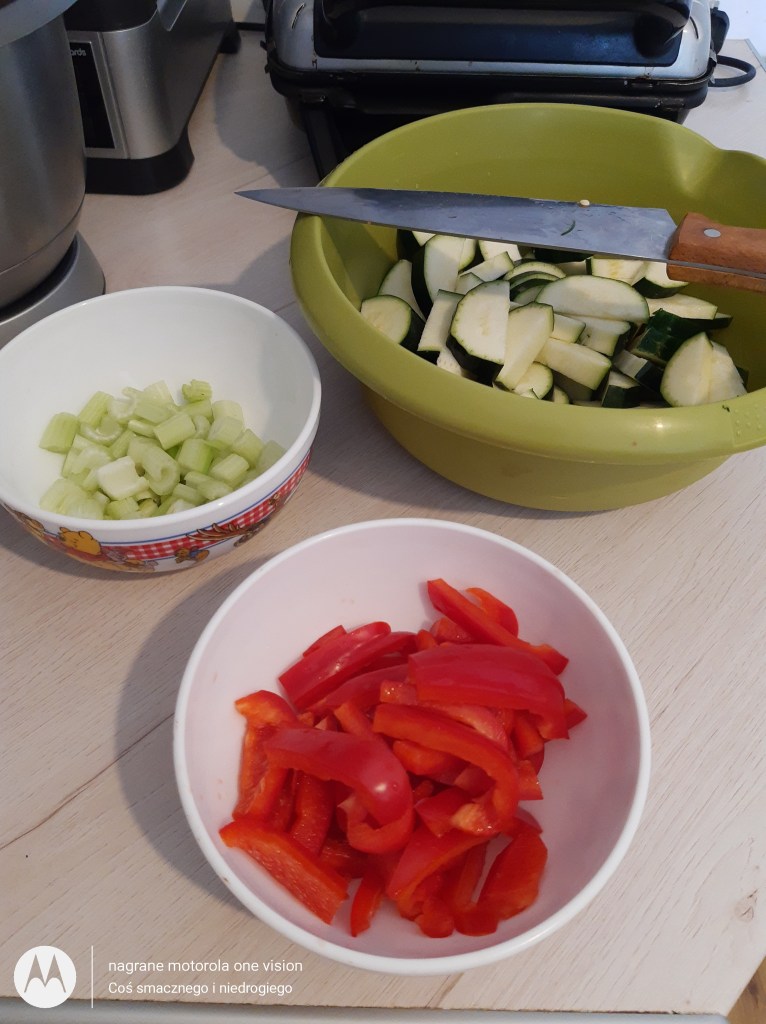Podobnie postępuję z cukiniami, jedynie szatkuję je w pół-plasterki, a czerwoną paprykę w grubsze paseczki.