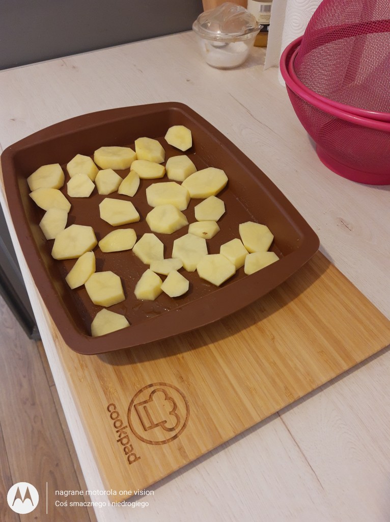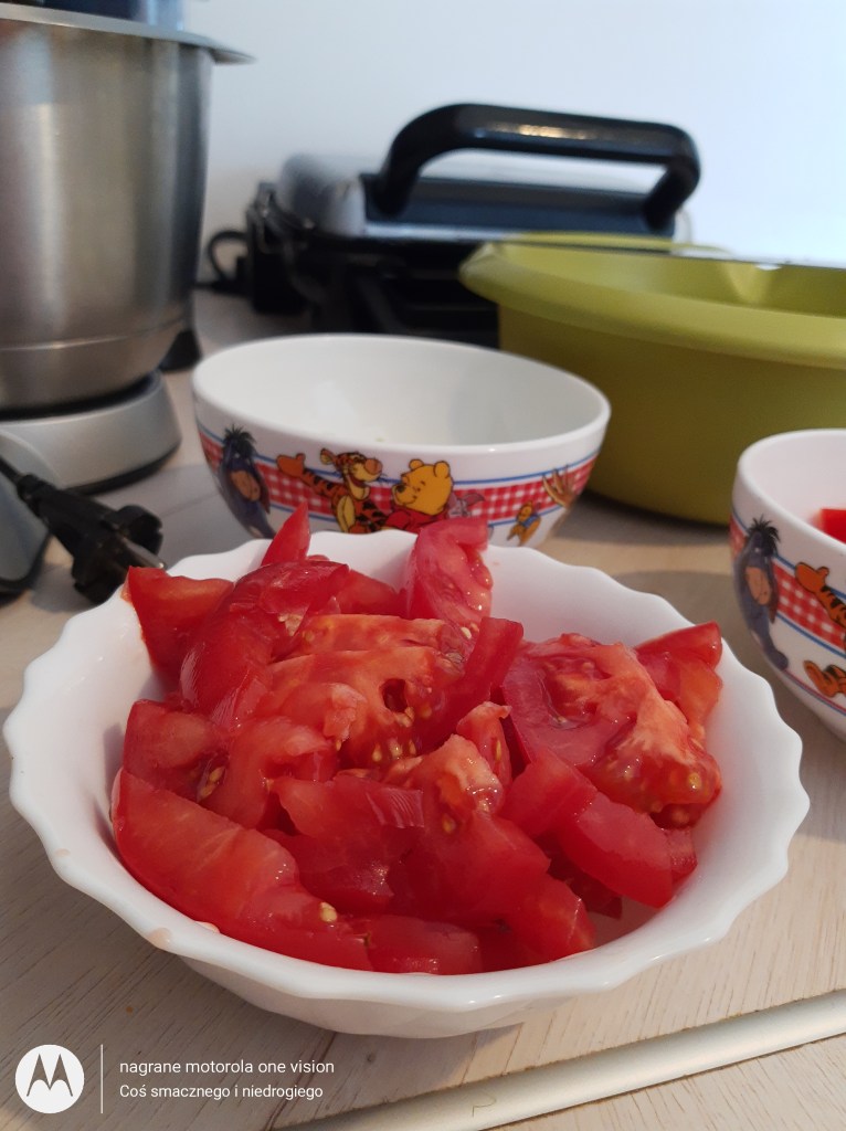 Następnie kroję w plasterki pomidory i obrane ziemniaki.