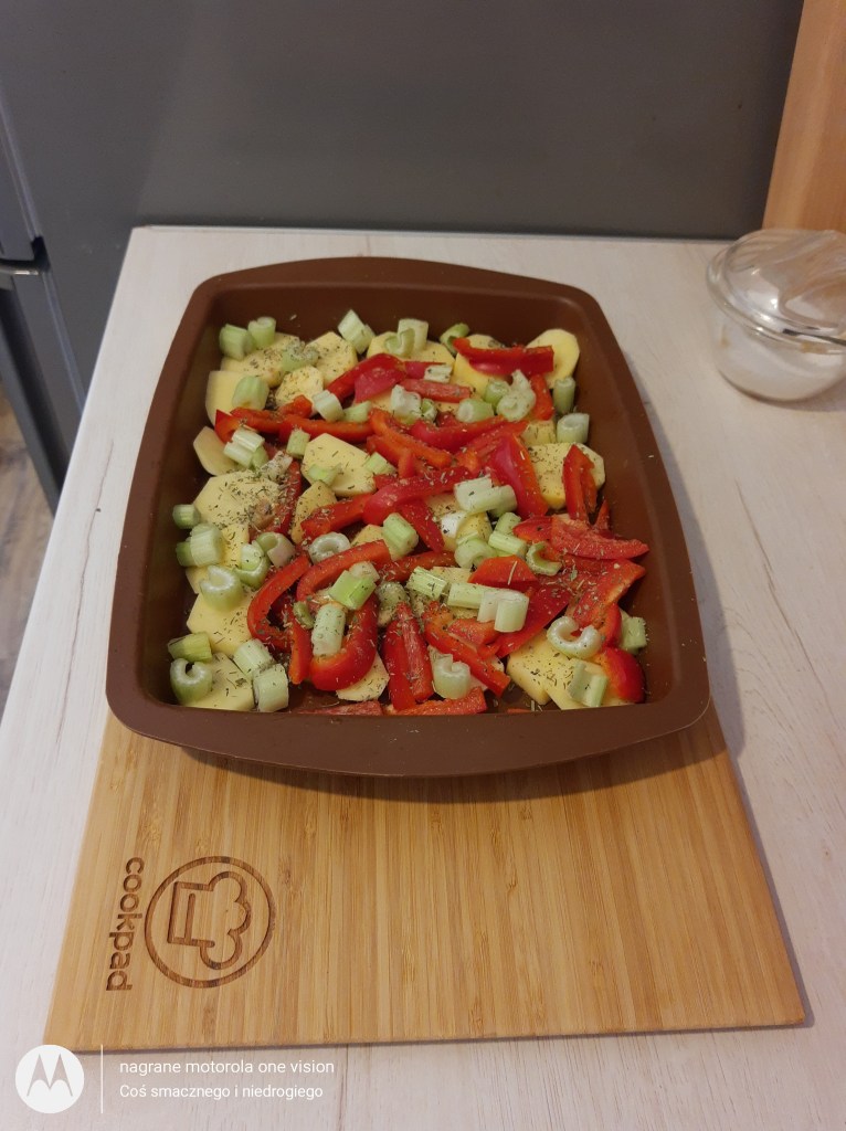 Dno formy silikonowej smaruję niewielką ilością oliwy oraz układam warstwę: ziemniaków, papryki i selera naciowego.