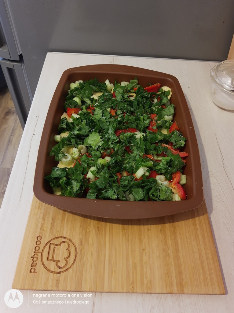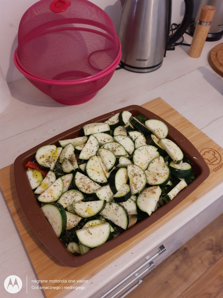 Na górę układam mrożony szpinak, zaraz potem cukinię i doprawiam pozostałymi przyprawami oraz skrapiam oliwą.