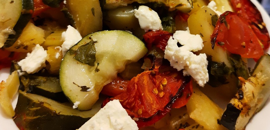 Warzywa posypuję: (połową ilości) soli, gałki muszkatołowej wraz z ziołami prowansalskimi i polewam oliwą.