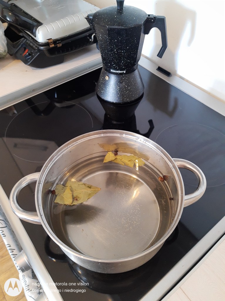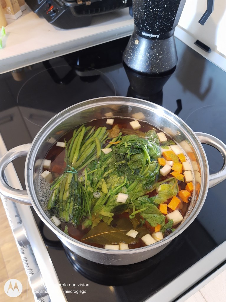 W garnku wlewam wodę i dodaję: liście laurowe oraz ziarenka ziela angielskiego i kiedy dojdzie do zagotowania dokładam: zamrożone warzywa (włoszczyzna, ogonki koperku, liście rzodkiewki) i ząbki czosnku oraz kawałek imbiru.